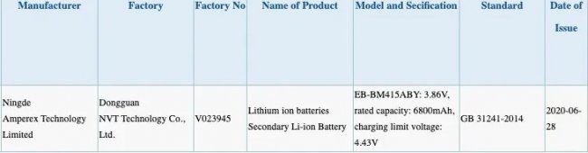 Литий-ионный аккумулятор имеет шифр EB-BM415ABY и изготовлен китайской компанией Ningde Amperex Technology Limited.