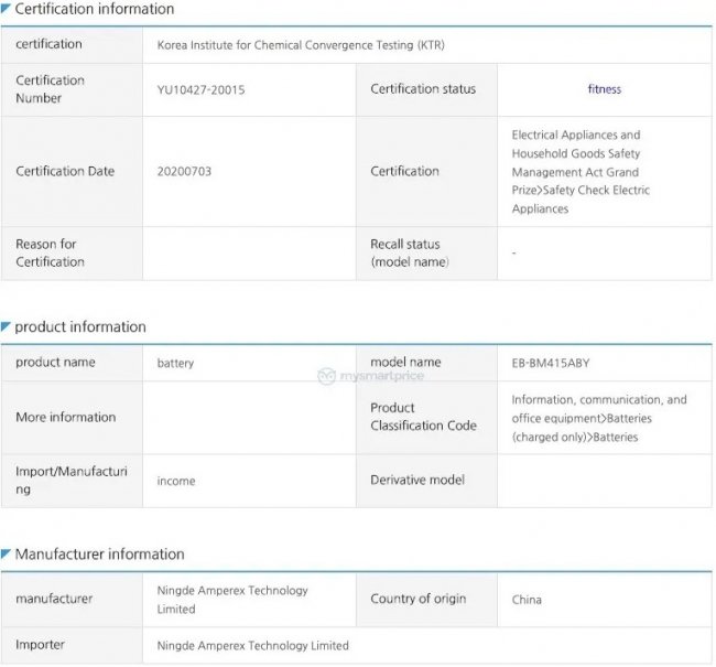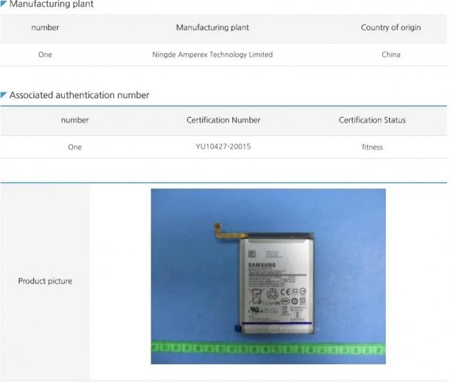Именно такой аккумулятор должен получить смартфон Galaxy M41. Хотя недавно ходили слухи о том, что его выход отменили, теперь гаджет прошел сертификацию 3C, а изображение аккумулятора появилось на сайте Safety Korea.