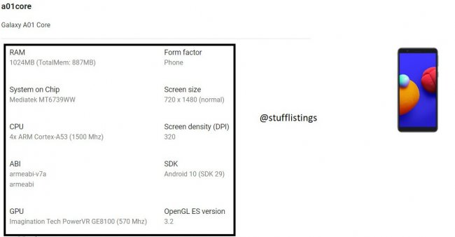 Итак, Galaxy A01 Core получит дисплей с толстыми рамками и разрешением HD+, а вот диагональ экрана пока остается загадкой. Также указан процессор MediaTek MT6739WW и всего 1 ГБ оперативной памяти.