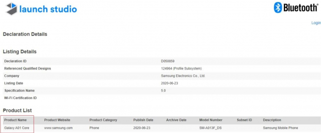 Наши коллеги из SamMobile рассказали, что компания Samsung готовит к выходу новый бюджетный смартфон, который сможет похвастаться съёмной батареей с объёмом на 3000 мАч. Новинку заметили в базе данных агентства Bluetooth SIG с номером модели SM-A013 и названием Galaxy A01 Core (линейка Core возвращается?).