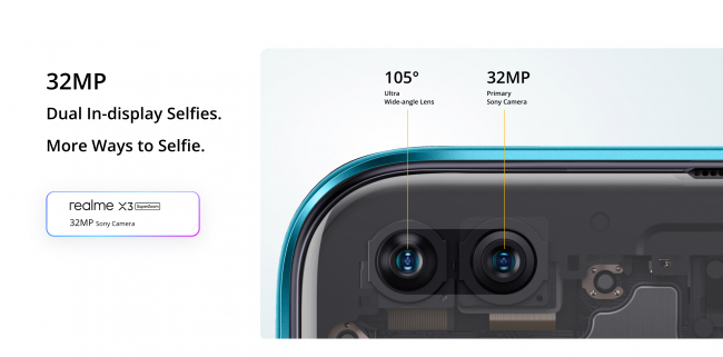 Realme X3 SuperZoom поставляется с 12 ГБ оперативной памяти и встроенным накопителем на 256 ГБ. Его главной особенностью стала камера. Она получила четыре модуля на 64 Мп + 8 Мп + 8 Мп + 2 Мп. Один из сенсоров — перископ с 5-кратным оптическим, 60-кратным цифровым зумом, поддержкой OIS и режимом Starry Mode для фотографий звёздного неба. Также камера получила режим для ночной съёмки Super Nightscape 4.0.