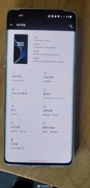 Эта информация касается старшей модели OnePlus 8 Pro. В сеть «слили» «живое» фото смартфона, точнее, включенного экрана с некоторыми характеристиками. Конечно, благодаря ранним утечкам мы многое уже знаем, но этот снимок подтверждает 6,78-дюймовый Fluid AMOLED дисплей с разрешением 2K и частотой обновления изображения 120 Гц. Также можно разглядеть вырез для фронтальной камеры в левом углу.