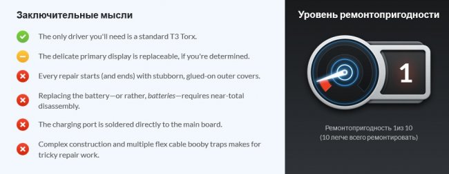 В результате «раскладушка» Motorola RAZR получила за ремонтопригодность всего 1 балл из 10. Получается, что смартфон практически невозможно отремонтировать.