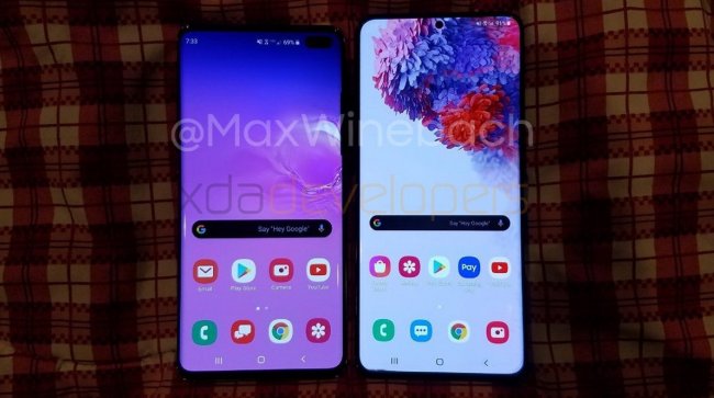 В первую очередь, видно, что это довольно массивный смартфон. Ему приписывают 6.7-дюймовый Super AMOLED-дисплей. На фото ниже можно сравнить новую модель с прошлогодним Galaxy S10+.