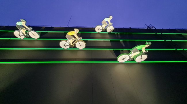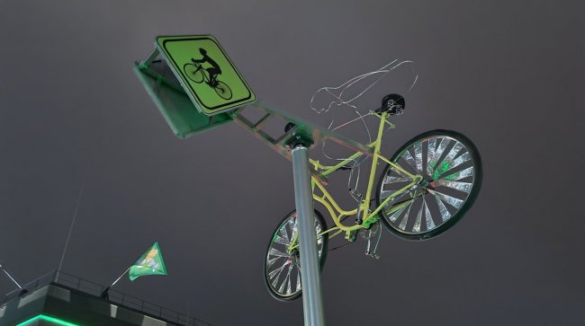 Ждал открытия нового магазина с огромной рекламной конструкцией из древнего велосипеда на фасаде. Велосипедисты появились на нем значительно раньше и интриговали местных пару месяцев. Я тоже гадал — что за велосипедный супермаркет открывается в наших краях. Снимки ночью выглядят даже эффектнее, чем днем. А велосипеды оказались частью концепции магазина, где внимание уделено зеленым технологиям (рядом есть паркинг с зарядками для электрокаров и фонари с солнечными панелями) и переработке мусора, которую и символизируют все эти окружности. У фигур велосипедистов есть фонари подсветки, что позволяет их снимать ночью с зумом как днем. Обратите внимание на серое небо на снимке с велосипедом на столбе — в реальности оно, конечно, черное, как и положено ночью, но так работают алгоритмы повышения динамического диапазона. Серое ночное небо — отличительная особенность ночных снимков, сделанных смартфоном сегодня.