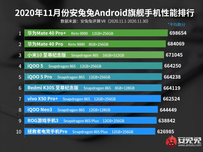 Среди топовых моделей новым лидером стал флагман Huawei Mate 40 Pro+ на базе процессора HiSilicon Kirin 9000 5G. Он набрал 698 654 балла. А его младший брат Mate 40 Pro с 684 069 баллами занимает второе место.