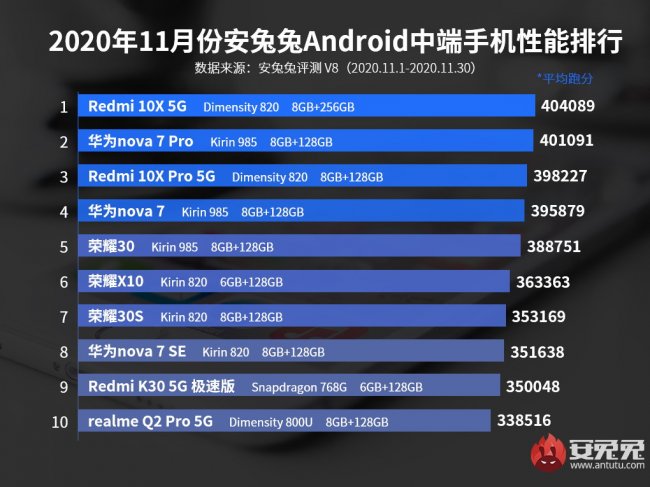 В рейтинге устройств среднего сегмента первую строчку занимает Redmi 10×5G на базе MediaTek Dimensity 820 с 404 089 баллами. Кстати, первенство он отобрал у Redmi 10X Pro 5G (398 227 баллов) с тем же процессором, который сейчас расположился на третьей строчке. «Серебро» у Huawei nova 7 Pro с результатом 401 091 балл.