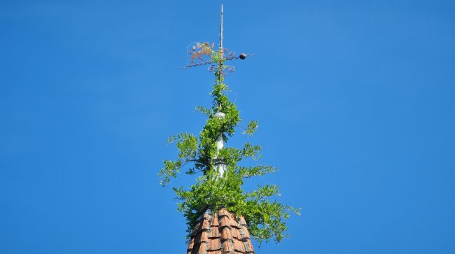 Оптически можно приблизить недоступные фотографу объекты и увидеть детали. Например, рассмотреть поближе кованный флюгер на башне замка графа Шенборна или взглянуть на кладку черепицы: