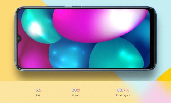 Смартфон получил 6,5-дюймовый IPS дисплей с разрешением 1560×720 точек, соотношением сторон 20:9 и небольшим «подбородком» внизу. Для 5-мегапиксельной фронтальной камеры предусмотрен каплевидный вырез.
