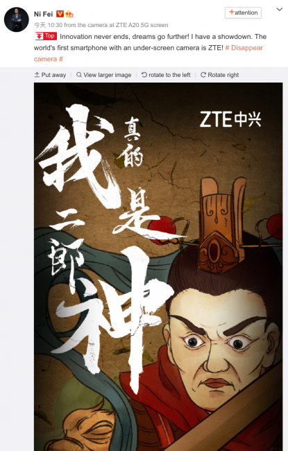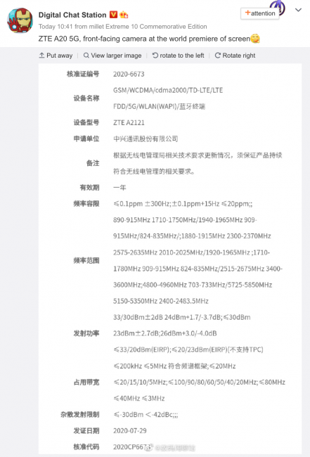 По словам CEO, компания первая в мире выпустит на рынок смартфон с подэкранной камерой. То есть в таком аппарате не будет вырезов и отверстий на экране. К сожалению, никаких подробностей о самой новинке Фей не сообщил, но по словам инсайдера Digital Chat Station, речь идёт о ZTE A20 5G (aka ZTE Axon 20 5G). Новинка уже прошла сертификацию SRRC (State Radio Regulation of China) в Китае с номером модели ZTE A2021.