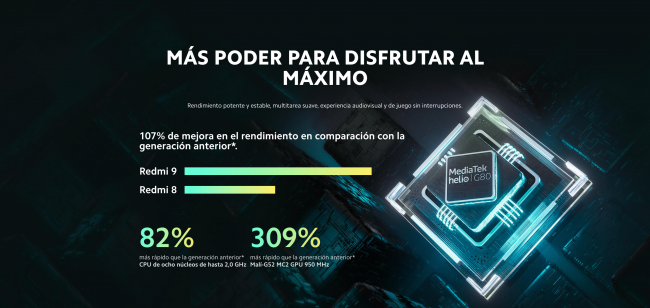 Под капотом Redmi 9 установили восьмиядерный 12-нанометровый процессор MediaTek Helio G80. Он имеет два ARM-ядра Cortex-A75 с максимальной частотой 2.0 ГГц и шесть ядер Cortex-A55 с максимальной частотой 1.8 ГГц. За графику SoC отвечает видеоускоритель Mali-G52, который работает на частоте 950 мГц.