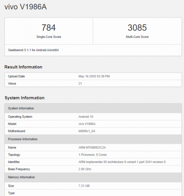Тестовая модель устройства проходит с номером модели vivo V1986A, 8 ГБ ОЗУ и операционной системой Android 10 на борту. В одноядерном тесте смартфон набирает 784 балла, а в многоядерном — 3085. Если сравнивать новый SoC с чипами Snapdragon 865 и Kirin 990 на примере Motorola Edge+ и Huawei Mate 30 Pro 5G соответственно, то результаты плюс-минус похожи.