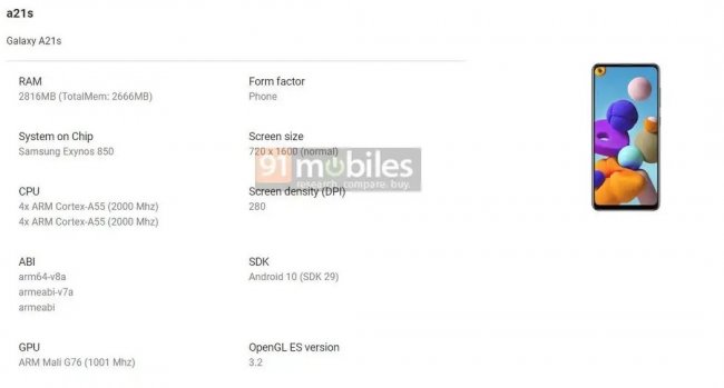 Также есть некоторые характеристики Galaxy A21s: это 3 ГБ оперативной памяти, дисплей HD+ с разрешением 720×1600 пикселей, новый процессор Exynos 850 и операционная система Android 10.