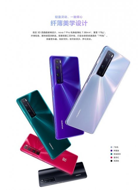 «Старший брат» Nova 7 Pro оснастили более крупным 6,57-дюймовым изогнутым Full HD + OLED-дисплем с разрешением 2340 X 1080 пикселей. Чипсет тот же, что и у классической версии — Kirin 985 с 8 ГБ оперативной памяти и до 256 ГБ встроенной памяти. Смартфон работает на Android 10 c EMUI 10.1.
