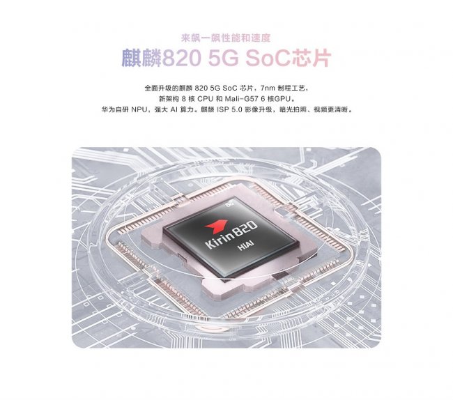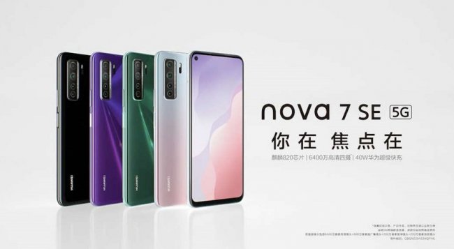Nova 7 SE очень похож на Nova 7, но Huawei сделала его более доступным. Смартфон оснащён 6,5-дюймовым LCD-дисплеем с разрешением FHD+ и процессором Kirin 820 вместо более нового Kirin 985. Объём памяти как и в предыдущих моделях составляет 8 ГБ оперативной и до 256 ГБ встроенной памяти.