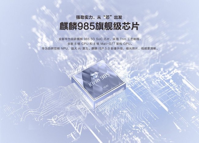 Nova 7 оснащён 6,53-дюймовым Full HD + OLED-дисплеем с частотой 60 Гц, разрешением 2400 х 1080 пикселей и поддержкой HDR10. Устройство работает на процессоре Kirin 985 со встроенным модемом 5G, имеет 8 ГБ ОЗУ и внутреннее хранилище 128 ГБ / 256 ГБ, есть слот для microSD. Операционная система — Android 10 с прошивкой EMUI 10.1.