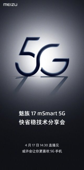 Аппарат выйдет на рынок с названием Meizu 17 mSmart 5G. Его, согласно официальному постеру, покажут на онлайн-мероприятии 17 апреля. То есть, в эту пятницу. Анонс состоится в 14:30 по-местному времени (в 9:30 по Киеву).