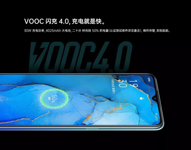Oppo Reno3 получил 6,4-дюймовый AMOLED дисплей с разрешением 2400×1080, соотношением сторон 20:9 и вырезом-капелькой для 32-мегапиксельной фронтальной камеры.