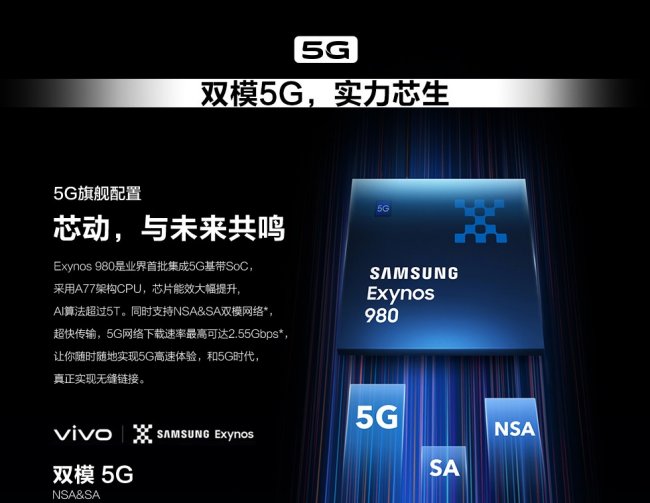 Также Vivo X30 и X30 Pro стали первыми смартфонами с новым чипом Exynos 980 от Samsung. Он идет со встроенным модемом 5G, максимальная скорость загрузки — 3,55 Гбит/с. Объем оперативной памяти — 8 ГБ, хранилища — 128 либо 256 ГБ.
