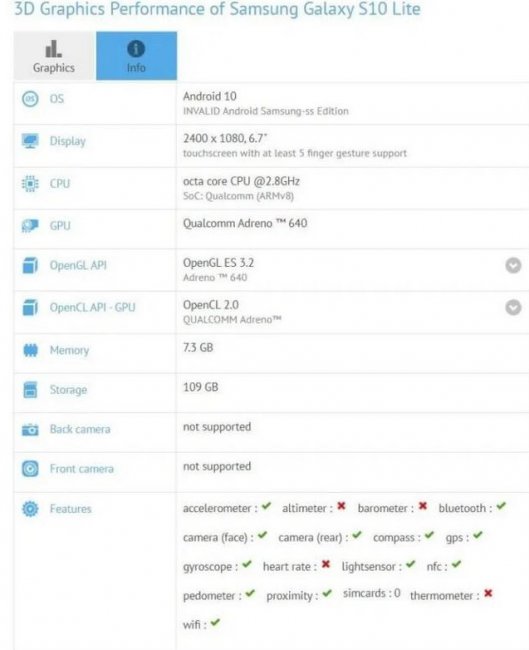Для начала, смартфон появился в базе данных бенчмарка GFXbench, благодаря чему подтвердились некоторые характеристики Galaxy S10 Lite.