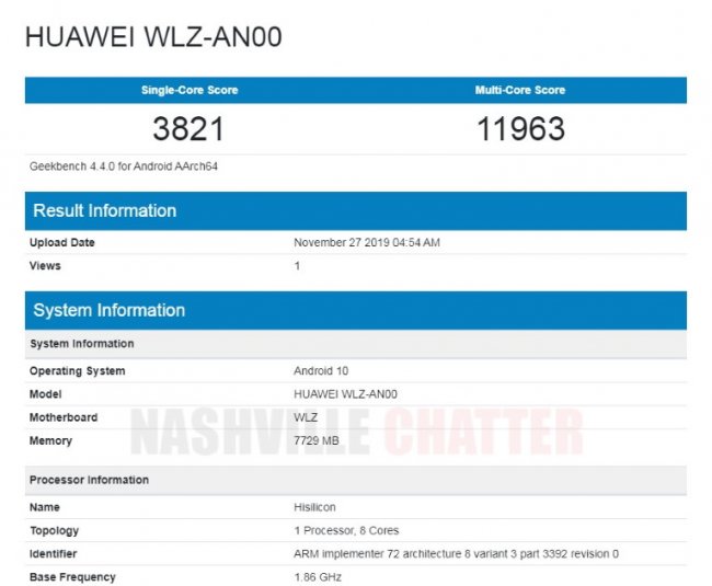 Согласно тесту производительности, аппарат проходит с номером модели WLZ-AN00. Новинка работает на топовом процессоре Kirin 990. Он, кстати, также установлен во флагманских линейках Honor V30 и Huawei Mate 30. Чип построен по 7-нанометровому техпроцессу и поставляется с интегрированным модемом 5G. Он имеет два высокопроизводительных (Cortex-A76), два средних (Cortex-A76) и четыре маленьких ядра (Cortex-A55) с частотой 2.86 ГГц, 2.36 ГГц и 1.95 ГГц соответственно.