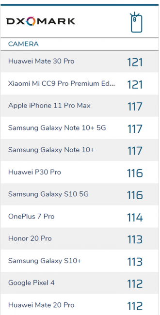 А вот Huawei P30 Pro и Samsung Galaxy S10 5G пришлось опуститься ниже с 116 баллами.