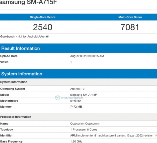 Журналисты издания MySmartPrice нашли в базе данных Geekbench результаты теста новинки с номером модели SM-A715F. Тестовый образец смартфона работает на том же чипе, что и оригинальный Galaxy A70 — Snapdragon 675. Возможно, финальная модель всё-таки получит более мощный чип. Например, Snapdragon 730/730G.