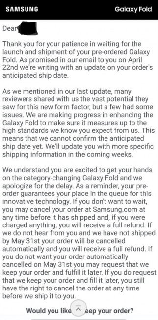 Samsung до сих пор не знает, когда выпустит в продажу свой складной смартфон Galaxy Fold. Зато компания разослала уведомления пользователям, которые оформили предзаказ на устройство.