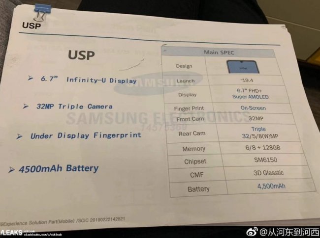 Речь идёт о Galaxy A60. Согласно утечке, устройство оснастят гигантским дисплеем на 6.7 дюймов с каплевидным вырезом, разрешением Full HD+ и матрицей Super AMOLED. Сканер отпечатков пальцев установят под экраном, как у Galaxy A50. За производительность смартфона будет отвечать чип SM6150. Это кодовое название процессора Snapdragon 675. Он, кстати, установлен в Redmi Note 7 Pro.