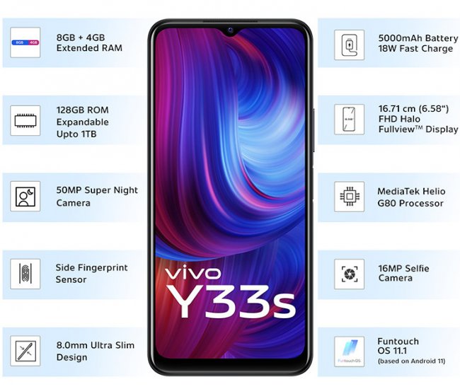 Новинку назвали Vivo Y33s. Аппарат получил пластиковый корпус с габаритами 164.26×76.08×8 мм и весом 182 г, а также плоский 6.58-дюймовый LCD-экран с разрешением 2408×1080p и каплевидным вырезом. За производительность устройства отвечает процессор MediaTek Helio G80. SoC работает в паре с 12 ГБ ОЗУ (8 ГБ физической + 4 ГБ виртуальной). Поставляется новинка с накопителем на 128 ГБ (+ microSD) и фирменной оболочкой Funtouch OS 11.1 на основе Android 11.