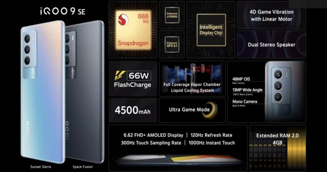 Под капотом новинки установили прошлогодний флагманский процессор Snapdragon 888. Смартфон будет поставляться в двух модификациях памяти: 8/128 ГБ и 12/256 ГБ. Что касается камер, то их в iQOO 9 SE четыре штуки: тройная основная на 48 МП (IMX598) + 8 МП (ширик) + 2 МП и одинарная фронтальная на 16 МП. Питается устройство от аккумулятора на 4500 мАч. Он поддерживает быструю зарядку на 66 Вт. В новинке есть подэкранный сканер, порт USB Type C, Bluetooth 5.2 и Wi-Fi 6. Смартфон имеет пластиковый корпус с весом в 196 грамм.