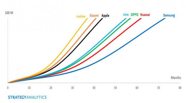 Компания Realme стала самым быстро растущим брендом смартфоном в мире. Она за три года с момента основания смогла поставить на рынок 100 млн умных телефонов. Чтобы достичь этой отметки производителю потребовалось 37 месяцев. Такими темпами не могут похвастаться ни Samsung, ни Apple, ни Huawei, ни