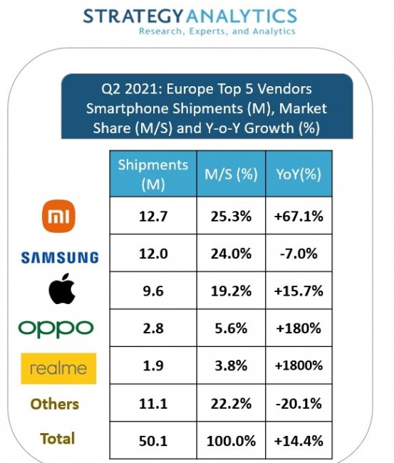 На всех остальных производителей суммарно приходится менее четверти рынка (22,2%) и 11,1 млн устройств. В сравнении с базисным периодом рынок смартфонов в Европе вырос на 14,4% и составил 50,1 млн единиц.