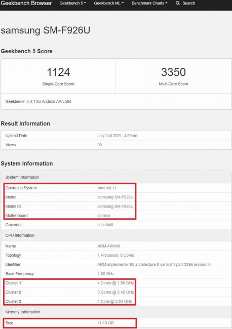 Galaxy Z Fold 3 появился в базе данных теста производительности Geekbench с номером модели SM-F926U. В отчёте говорится, что аппарат будет работать на обычном процессоре Snapdragon 888, а не на его разогнанной версии. Кроме этого, новинка будет поставляться с Android 11 на борту и 12 ГБ ОЗУ. Кстати, поговаривают, что на рынок также может выйти версия с 16 ГБ оперативки.