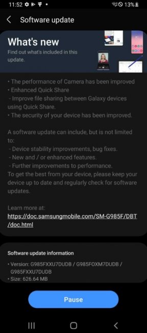 Система для Galaxy S20, Galaxy S20+ и Galaxy S20 Ultra получила номер сборки G98xxXXU7DUDB и весит около 600 МБ. В обновление добавили такой же список изменений. То есть разработчики установили майский патч безопасности, который закрывает несколько уязвимостей в системе. Кроме этого, в прошивке улучшили работу камеры, а также функцию Quick Share для быстрой передачи файлов (аналог Apple AirDrop).