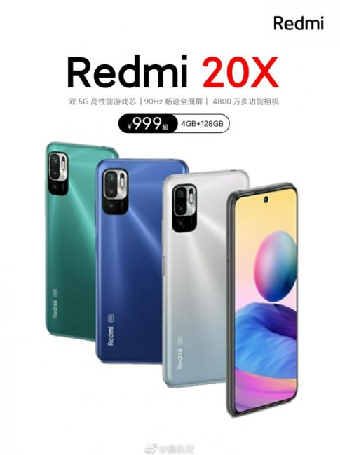 Согласно утечке, аппарат назовут Redmi 20X и он будет преемником прошлогоднего Redmi 10X 5G. Новинка получит «дырявый» дисплей с поддержкой частоты обновления 90 Гц, основную тройную камеру с главным датчиком на 48 МП, 4 ГБ ОЗУ, 128 ГБ ПЗУ, а также поддержку сети пятого поколения. Продавать смартфон будут в четырёх расцветках и ценником в $152.