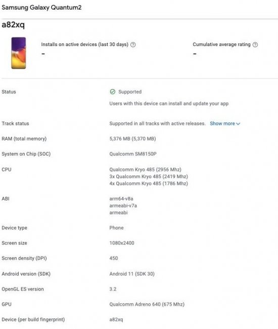 Изображение смартфона и его некоторые характеристики появились на сайте Google Play Console. Новинка, согласно утечке, получит уже традиционную для аппаратов Samsung фронтальную камеру. Её установят в отверстии экрана. Также в описании говорится, что Galaxy A82 будет иметь панель с разрешением FHD+, процессор Snapdragon 855+ и 6 ГБ оперативной памяти. Поставляться новинка должна с операционной системой Android 11.
