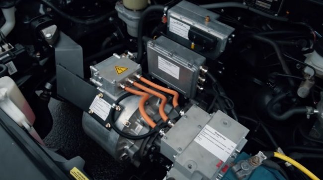 Как и полагается электрокару, под капотом отсутствует двигатель внутреннего сгорания, а его место занимает мотор-редуктор и электроника (инвертор, распределительная коробка, силовой преобразователь и т.д.). А вот штатная бортовая электросеть осталась без изменений и питается от 12-вольтного аккумулятора.