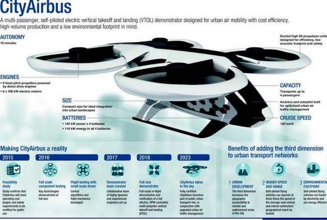 Европейский авиационный гигант Airbus объявил о первых успешных тестах проекта CityAirbus. Компания сообщила, что концепция летающего такси уже близка к реализации, а первый аппарат будет испытан в воздухе уже к концу следующего года. На начальном этапе тесты будут проводится в беспилотном режиме, после чего четырехместный VTOL протестируется с человеком-пилотом на борту. Полностью автономные коммерческие перелеты планируется начать к 2023 году.