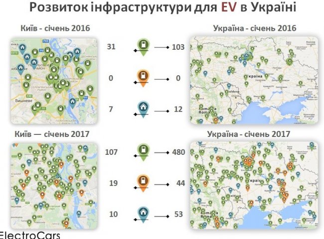 За 2016 год количество зарядных станций для электрокаров в Киеве выросло с 38 до 136 штук, следующим городом по интенсивности развития инфраструктуры стал Харьков – 92 электрозаправки. В общем по Украине количество общественных зарядок выросло с 153 до 577 штук, а число станций быстрой зарядки подскочило с 0 до 44. Таким образом, сегодня на станцию приходится около 4-х электрокаров.