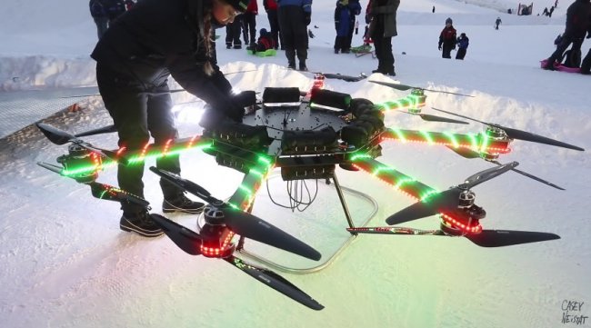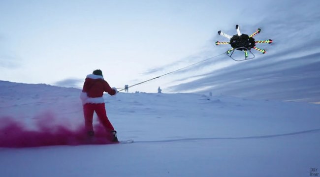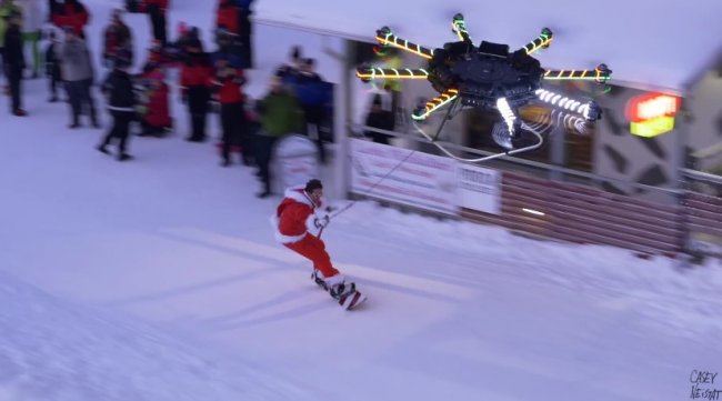 Команда любителей экстремальных видов спорта (и техники) из США сконструировала мощный дрон, который способен подымать в воздух взрослого человека. Первый в истории человечества полет был осуществлен с помощью мультикоптера и привязанного к нему сноубордиста. Свой умопомрачительный рекорд американцы засняли на зажигательное новогоднее видео.