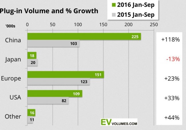 За ним следуют США, где за три квартала 2016 было продано 44 530 электрокаров (прирост 62%) и Европа с чуть менее быстрыми темпами роста – 51 050 единиц (+ 24%).
