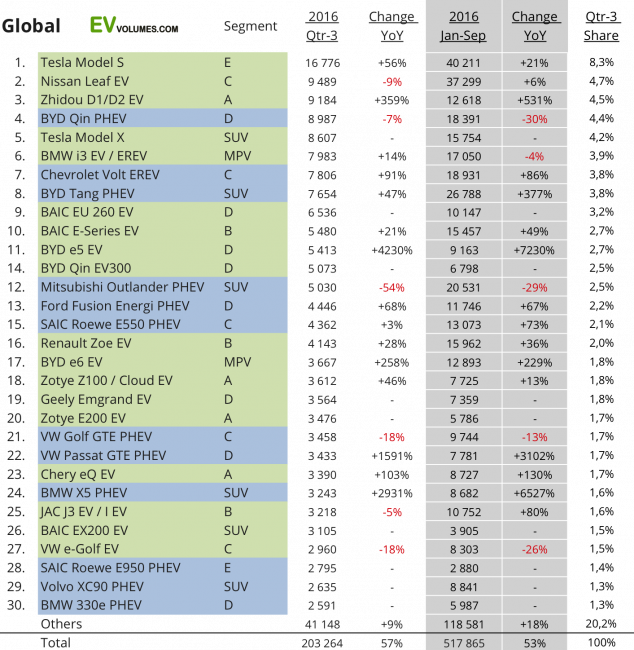 Самой продаваемой маркой в сентябре стала Tesla с почти 13 000 проданных электромобилей. Лидирующими брендами за весь текущий год стали: 1 – BYD с 75 320; 2 – Тесла с 56 000; 3 – Volkswagen с 42 500 поставленных электрокаров. Среди полностью электрических авто первое место занимает Tesla с долей 17,6% от всех BEV реализованных за период с января по сентябрь 2016 года.