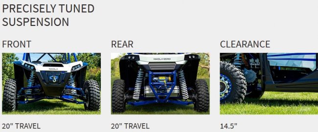 Мотовездеход оснастили силовым агрегатом мощностью 520 л. с. Полноприводной багги разгоняется с 0 до 96 км за 3 секунды. Запас хода также достаточно серьезный — на одном заряде Nikola Zero может проехать от 160 до 321 км. Пробег можно увеличить еще на 16 км, если оборудовать крышу электрокара солнечными батареями на 400 ватт (это предусмотрено конструкцией).