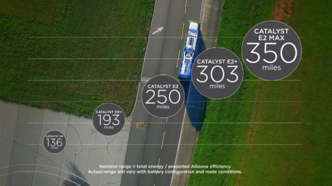 Блок тяговых батарей Catalyst E2 обладает емкостью от 440 до 660 кВт⋅ч и обеспечивают дальность хода от 312 до 563 км, в зависимости от выбранной конфигурации. Как показали испытания на треке Michelin’s Laurens Proving Grounds автобусу с самой емкой батареей удалось проехать почти 1000 км на одном заряде.