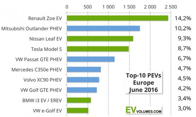 Что касается самых продаваемых моделей, то Renault Zoe занял первое место в июне, что составляет примерно 14,2% от всех продаж электрокаров в Европе. За ним следует гибрид Mitsubishi Outlander PHEV (10,2%), Nissan LEAF (9,3%) и Tesla Model S (8,7%).