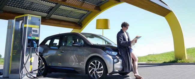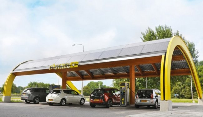 Станции зарядки Fastned получают электроэнергию от накрышных солнечных панелей и от энергии ветра. Одновременно заряжаться могут три электромобиля.