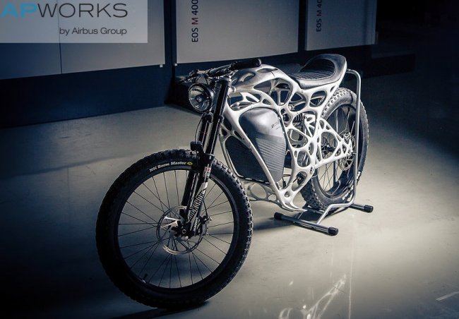 «Light Rider» — электрический мотоцикл, который весит всего около 35 килограммов и оснащен ультралегкой рамой, выполненной по технологии лазерного спекания. Его разработчик – APWorks - дочерняя компания европейского авиагиганта «Airbus», изготовила основные компоненты байка с помощью 3D-принтера, причем рама сделана из авиационного алюминия высшего качества путем нанесения множества тончайших слоев металла на основу из металлической пудры.