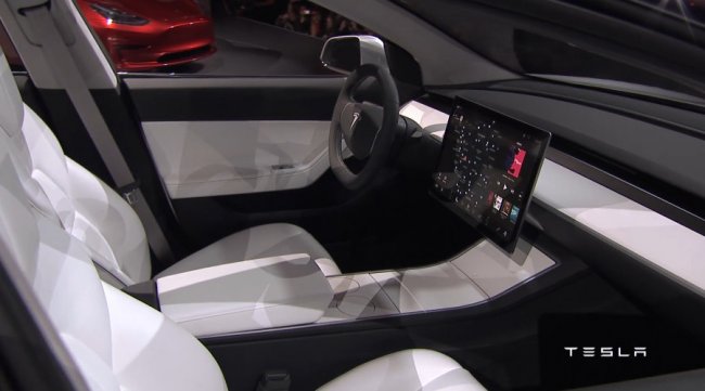 Внутреннее убранство Model 3 также напоминает интерьер флагманского электромобиля компании. Здесь нет традиционной приборной панели – вместо нее сенсорный дисплей, но в отличие от 17-дюймового экрана Model S, бюджетная Tesla оснащена горизонтальным 15-дюймовым монитором, который выступает отдельно от центральной консоли.