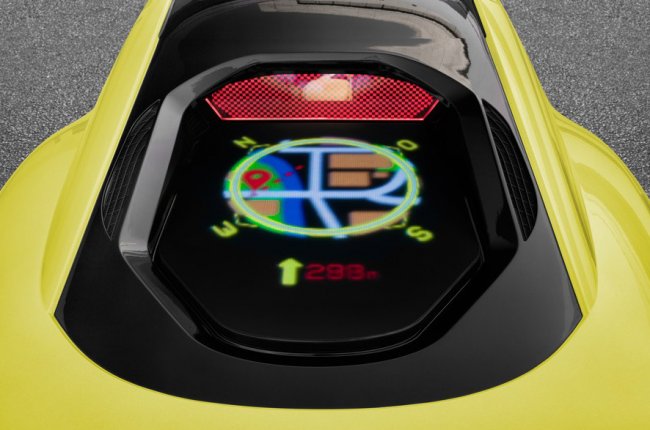 Задняя часть кузова суперкара Rinspeed Ʃtos представляет собой взлетно-посадочную площадку для персонального дрона со светодиодной индикацией, которая может одновременно служить внешним дисплеем. С помощью летающего беспилотника наземный беспилотник получает удаленные «глаза и уши», которые могут использоваться по самому разнообразному назначению: от корректировки маршрута и доставки небольших заказов из интернет-магазина - до высотных фото/видеосъемок и простых развлечений.